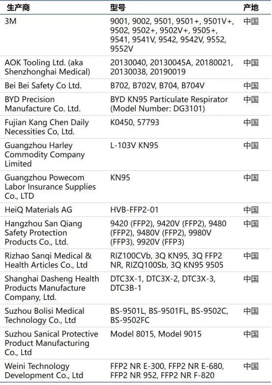 附:FDA 授權(quán)進口的非 NIOSH 批準(zhǔn)的中國口罩商名單(5月7日更新)