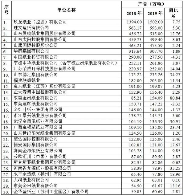 附表:2019年重點造紙企業(yè)產(chǎn)量前30名企業(yè)