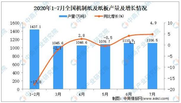 根據(jù)中國輕工業(yè)信息中心數(shù)據(jù)顯示,2020年1-7月,全國機(jī)制紙及紙板產(chǎn)量6843.8萬噸,同比下降3.3%。7月當(dāng)月,全國機(jī)制紙及紙板產(chǎn)量1106.5萬噸,同比增長4.9%。