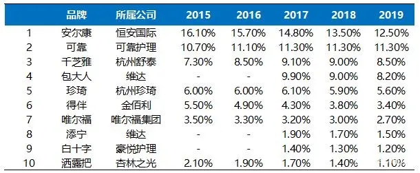 在企業(yè)數(shù)量上,2018年統(tǒng)計(jì)在冊(cè)的成人失禁用品生產(chǎn)企業(yè)有448家。本土廠商包括杭州可靠、恒安國(guó)際、豪悅護(hù)理等,外資廠商包括金佰利、尤妮佳等。目前成人失禁用品以國(guó)內(nèi)品牌為主,2019年國(guó)內(nèi)品牌恒安國(guó)際安爾康、杭州可靠、杭州舒泰千芝雅市占率分別為12.5%、11.3%、8.5%,占據(jù)前三。