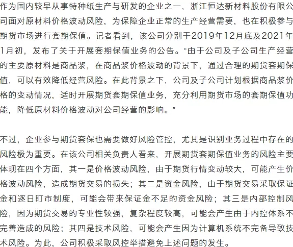 “為了規(guī)避突發(fā)事件對紙漿需求的影響,國貿(mào)紙業(yè)在去年1月份通過賣出套保鎖定了在手貨物的預(yù)期利潤。同樣的,在4月份國外疫情開始暴發(fā)的時候,出于對后市海外需求銳減的考慮,國貿(mào)紙業(yè)也及時通過套期保值對沖了在途貨物的價格風(fēng)險。”