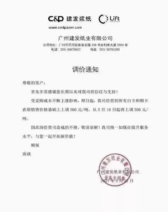 廈門國(guó)貿(mào)紙張華南區(qū):即日起,對(duì)我司經(jīng)營(yíng)的全線白卡紙、銅版紙產(chǎn)品在原售價(jià)基礎(chǔ)上統(tǒng)一上調(diào)500元/噸。自5月10日起,再上調(diào)500元/噸。