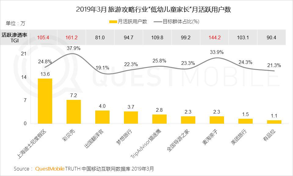 在親子旅游方面,隨著親子節(jié)目的熱播,讓近兩年親子游市場持續(xù)火爆。在旅游攻略APP中,彩貝殼目標(biāo)群體占比37.9%,其次為麥淘親子33.9%,而麥淘親子、上海迪士尼、彩貝殼等親子游類的旅游攻略受到低幼家長的青睞。從中可以看到隨著對(duì)教育要求的全面升級(jí),孩子的眼界和經(jīng)歷、親子陪伴也成為了父母關(guān)注的一大重點(diǎn)。