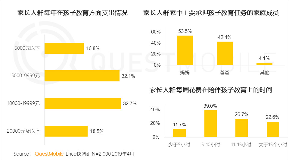而在家庭人群每年在孩子教育方面支出情況,超八成的家長每年在孩子的教育方面支出均在5000元以上,其中10000-19999元占32.7%,5000-9999元占32.1%??梢娙藗儗?duì)于孩子的教育成長真是寄予厚望。而在家長人群中媽媽作為主要承擔(dān)孩子教育任務(wù)占53.5%。從中可以看到在孩子的教育問題上,“媽媽”才是教育決策的主要決策者。而在家長人群每周花費(fèi)在陪伴孩子教育上的時(shí)間5-10小時(shí)占比最高,達(dá)到39%。