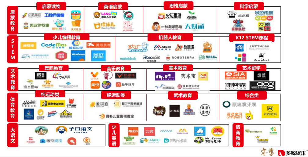 從素質(zhì)教育細(xì)分賽道典型公司來看,產(chǎn)品類型覆蓋啟蒙教育、藝術(shù)教育、早幼教平臺(tái)、少兒編程教育、情商教育等。