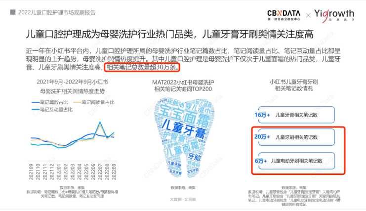 具體來看,相關(guān)筆記總數(shù)量超30萬條。其中,關(guān)于兒童牙刷(包括傳統(tǒng)和電動)的筆記共有26萬+。也正因此,我國兒童基礎(chǔ)口腔護(hù)理產(chǎn)品(包括牙刷和牙膏)的滲透率正在逐步提升,2016年只有28.4%,預(yù)計(jì)到2022年將達(dá)到38.7%。