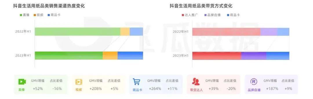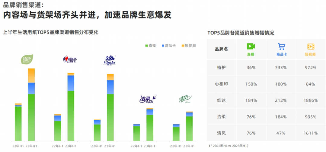 根據(jù)去年生活用紙TOP5品牌渠道銷(xiāo)售增幅變化數(shù)據(jù)顯示,相較于其他渠道方式,直播帶貨銷(xiāo)售額總體上較22年增長(zhǎng)額最大,最高可達(dá)至184%,內(nèi)容場(chǎng)與貨架場(chǎng)齊頭并進(jìn),加速品牌生意爆發(fā)。