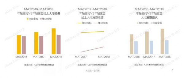 在更為開放、富足的環(huán)境下成長起來的80、90后年輕一代,大多受過良好的教育,生活水平也有所提高,他們在育兒觀念上更加開放,在包括紙尿褲在內(nèi)的眾多母嬰用品上,年輕寶爸寶媽更舍得花錢,他們有強烈的消費意愿,還具備足夠的支付能力,成為母嬰消費市場的中堅力量。數(shù)據(jù)顯示,近年來,年輕寶媽寶爸的線上人均消費逐年提升。相比寶爸,寶媽的增速更快,達到兩位數(shù)的高速增長,消費潛力巨大。從消費頻次來看,年輕寶媽更愛剁手,他們的消費頻次遠高于寶爸。